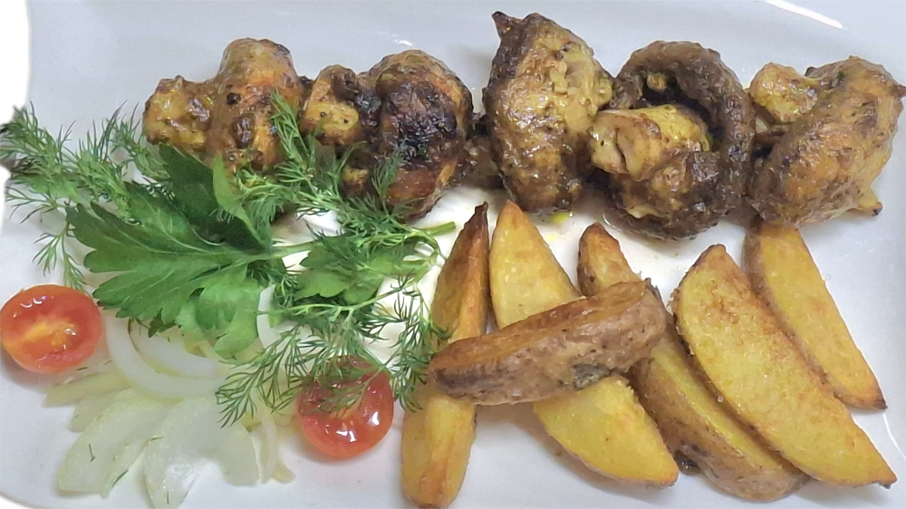 Куриное филе, томаты черри, картофель по деревенски, лук маринованный, специи грузинские, зелень
